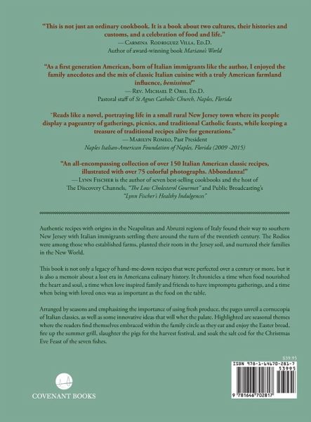 Authentic recipes with origins in the Neapolitan and Abruzzi regions of Italy found their way to southern New Jersey with Italian immigrants settling there around the turn of the twentieth century. The Rodios were among those who established farms, planted their roots in the Jersey soil, and nurtured their families in the New World. This book is not only a legacy of hand-me-down recipes that were perfected over a century or more, but it is also a memoir about a lost era in Americana culinary history. It chronicles a time when food nourished the heart and soul, a time when love inspired family and friends to have impromptu gatherings, and a time when being with loved ones was as important as the food on the table. Arranged by seasons and emphasizing the importance of using fresh produce, the pages unveil a cornucopia of Italian classics, as well as some innovative ideas that will whet the palate. Highlighted are seasonal themes where the readers find themselves embraced within the family circle as they eat and enjoy the Easter bread, fire up the summer grill, slaughter the pigs for the harvest festival, and soak the salt cod for the Christmas Eve Feast of the seven fishes.
