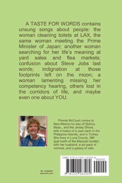 A TASTE FOR WORDS contains unsung songs about people: the woman cleaning toilets at LAX, the same woman meeting the Prime Minister of Japan; another woman searching for her life's meaning at yard sales and flea markets; confusion about Steve Jobs last words; indignation at those footprints left on the moon; a woman lamenting missing her competency hearing, others lost in the corridors of life, and maybe even one about YOU.