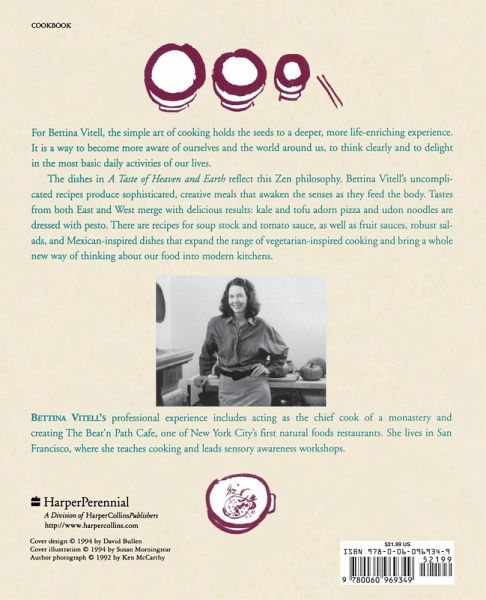 For Bettina Vitell the simple art of cooking holds the seeds to a deeper, more life-enriching experience. It is a way to become more aware of ourselves and the world around us, to think clearly and to delight in even the most basic daily activities of our lives. The dishes in "A Taste of Heaven and Earth" reflect this Zen philosophy. Bettina Vitell's uncomplicated recipes produce sophisticated, creative meals without ever losing site of her goal of preparing low-dairy vegetarian food. Tastes from both East and West merge with delicious results: here kale and tofu adorn pizza, and udon noodles are dressed with pesto. There are recipes for soup stock and tomato sauce, as well as cashew ginger sauce and apricot lime chutney. The homey breakfast and dessert sections provide recipes for muffins and crisps; and sections on pizza, sushi, curries, and Mexican-inspired foods expand the traditional range of vegetarian cooking. "A Taste of Heaven and Earth" explores beyond the reaches of traditional cook-books by offering contemplative essays and ink drawings that heighten the cook's sensory experience in the kitchen. They provide questions and stories that help readers realize the simplicity and beauty inherent in preparing and eating good food.