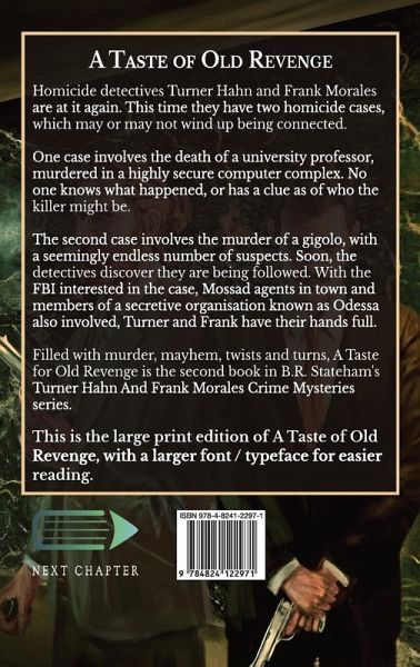 Homicide detectives Turner Hahn and Frank Morales are at it again. This time they have two homicide cases, which may or may not wind up being connected. One case involves the death of a university professor, murdered in a highly secure computer complex. No one knows what happened, or has a clue as of who the killer might be. The second case involves the murder of a gigolo, with a seemingly endless number of suspects. Soon, the detectives discover they are being followed. With the FBI interested in the case, Mossad agents in town and members of a secretive organisation known as Odessa also involved, Turner and Frank have their hands full. Filled with murder, mayhem, twists and turns, A Taste for Old Revenge is the second book in B.R. Stateham's Turner Hahn And Frank Morales Crime Mysteries series. This is the large print edition of A Taste of Old Revenge, with a larger font / typeface for easier reading.