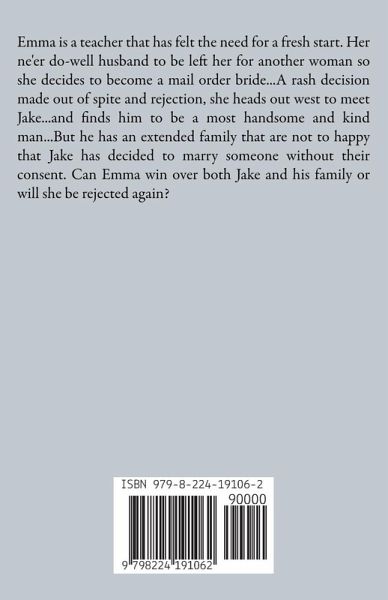 Emma is a teacher that has felt the need for a fresh start. Her ne'er do-well husband to be left her for another woman so she decides to become a mail order bride...A rash decision made out of spite and rejection, she heads out west to meet Jake...and finds him to be a most handsome and kind man...But he has an extended family that are not to happy that Jake has decided to marry someone without their consent. Can Emma win over both Jake and his family or will she be rejected again?