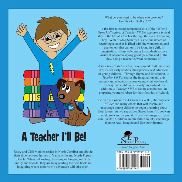 What do you want to be when you grow up? How about a TEACHER? In the first released companion title of the "When I Grow Up" series, "A Teacher I'll Be!" explores a typical day in the life of a teacher through the eyes of a young boy. With his dog Sam by his side, his dream of becoming a teacher is filled with the wonderment and excitement that can only be found in a child's imagination. From welcoming his students as they arrive at school to saying goodbye at the end of the day, being a teacher is what he dreams of. "A Teacher I'll Be!" is a fun, easy-to-read rhythmic story written for early readers, their parents, and educators of young children. Through rhyme and illustration, "A Teacher I'll Be!" sparks the imagination and aids parents and educators in conveying what teachers do in a way that children can easily understand. In addition, "A Teacher I'll Be!" can be a useful tool in preparing young children for their first day of school. Be on the lookout for "A Fireman I'll Be!", "An Engineer I'll Be!" and many others that will inspire and encourage young children to begin dreaming about their future. As we say at Lea Street Press, "If you can read it, you can imagine it. If you can imagine it, you can live it!" Children are the future so let's encourage them to read, imagine and live their dreams.