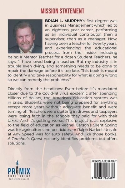 Directly from the headlines: Even before it's mandated closer due to the Covid-19 virus epidemic, after spending billions of dollars, the American education system was in crisis. Students were not being prepared for anything except more years without adequate benefit and were turning off. Teachers were quitting in droves and taxpayers were losing faith in the schools they paid for with their taxes. And it's getting worse. This project is as explosive to the field of education as Rachel Carson's "Silent Spring" was to agriculture and pestisides, or Ralph Nader's "Unsafe at Any Speed" was for auto safety. And like these books, "A Teachers Quest" not only identifies problems but offers solutions.