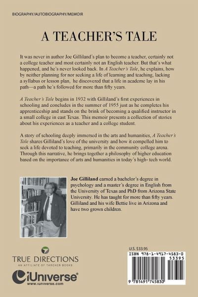 It was never in author Joe Gilliland's plan to become a teacher, certainly not a college teacher and most certainly not an English teacher. But that's what happened, and he's never looked back. In A Teacher's Tale, he explains, how by neither planning for nor seeking a life of learning and teaching, lacking a syllabus or lesson plan, he discovered that a life in academe lay in his path-a path he's followed for more than fifty years. A Teacher's Tale begins in 1932 with Gilliland's first experiences in schooling and concludes in the summer of 1955 just as he completes his apprenticeship and stands on the brink of becoming a qualified instructor in a small college in east Texas. This memoir presents a collection of stories about his experiences as a teacher and a college student. A story of schooling deeply immersed in the arts and humanities, A Teacher's Tale shares Gilliland's love of the university and how it compelled him to seek a life devoted to teaching, primarily in the community college arena. Through this narrative, he brings together a philosophy of higher education based on the importance of arts and humanities in today's high- tech world.