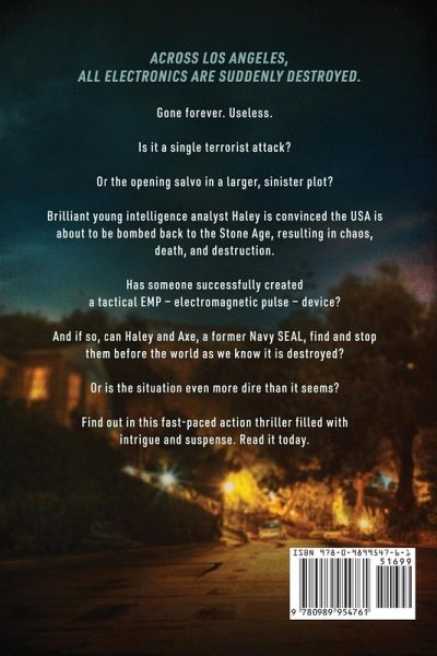 Across Los Angeles, all electronics are suddenly destroyed. Gone forever. Useless. Is it a single terrorist attack? Or the opening salvo i n a larger, sinister plot? Brilliant your intelligence analyst Haley is convinced the USA is about to be bombed back to the Stone Age, resulting in chaos, death, and destruction. Has someone successfully created a tactical EMP -- electromagnetic pulse -- device? And if so, can Haley and Axe, a former Navy SEAL, find and stop them before the world as we know it is destroyed? Or is the situation even more dire than it seems? Find out in the fast-paced action thriller filled with intrigue and suspense. Read it today.