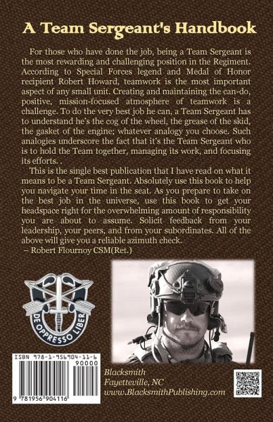 Being a Team Sergeant is the most rewarding and challenging position in the Regiment. According to Special Forces legend and Medal of Honor recipient Robert Howard, teamwork is the most important aspect of any small unit. Creating and maintaining the can-do, positive, mission-focused atmosphere of teamwork is a challenge. To do the very best job he can, a Team Sergeant has to understand he's the cog of the wheel, the grease of the skid, the gasket of the engine; whatever analogy you choose. Such analogies underscore the fact that it's the Team Sergeant who is to hold the Team together, managing its work, and focusing its efforts. This is the single best publication written on what it means to be a Team Sergeant. This book will help the leader navigate his time in the seat by helping him prepare for the overwhelming amount of responsibility that comes with the position.