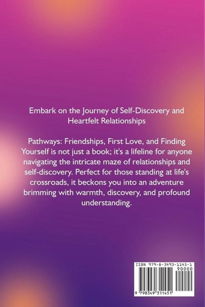 Embark on the Journey of Self-Discovery and Heartfelt Relationships Pathways: Friendships, First Love, and Finding Yourself is not just a book; it's a lifeline for anyone navigating the intricate maze of relationships and self-discovery. Perfect for those standing at life's crossroads, it beckons you into an adventure brimming with warmth, discovery, and profound understanding. Imagine a guide that tenderly holds your hand through the highs and lows of life's most pivotal moments. With keen insights into the primal importance of friendships (Chapter 1), you'll begin to weave strong, enduring bonds that can weather any storm. Discover how everyday acts of kindness and unwavering loyalty (Chapter 2) fortify connections in ways you never thought possible. As you delve deeper, embrace the exhilarating rush of first love (Chapter 3). Feel the pulse of emotions, and master the dance of open communication (Chapter 4) that can elevate any relationship to new heights. But life isn't just about others; it's also about nurturing your true self (Chapter 6), uncovering personal interests, values, and passions that excite your spirit. Are you ready to stand tall against the waves of self-doubt? Build resilience (Chapter 7) and find your unique place in the world (Chapter 8) without losing yourself. While balancing the delicate act between relationships and personal aspirations (Chapter 9), learn the art of healthy conflict resolution (Chapter 10) and eventually, navigate the pain of heartbreak with grace (Chapter 11). Let Pathways be your compass, leading you not just to growth and understanding of friendships and love but to a celebration of the everyday triumphs that define your personal journey (Chapter 12). Open its pages, and step into a world where every path leads to a deeper connection-with others and yourself.