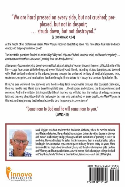 "We are hard pressed on every side, but not crushed; perplexed, but not in despair; . . . struck down, but not destroyed." (2 Corinthians 4:8-9) At the height of his professional career, Mark Wiggins received devastating news. "You have stage four head and neck cancer, and the prognosis is not good." The inevitable questions flooded his mind: Why? Why me? Why now? I don't smoke or drink, and I exercise regularly . . . I train and run marathons. How could I possibly have this deadly disease? A Temporary Inconvenience is a deeply personal look at Mark Wiggins' journey through the most difficult battle of his life-stage four cancer. With the help and love of his family and friends, including his two daughters and devoted wife, Mark decided to chronicle his arduous journey through the uncharted territory of medical diagnoses, tests, treatments, surgeries, and medications that have brought him to where he is today: in a constant fight for his life. If you've ever wondered how someone who holds a deep faith in God walks through life's toughest challenges, then you need to read Mark's story. Everything is laid bare . . . the struggles and victories, the disappointments and successes. And in the midst of this impossibly difficult journey, you will also hear the melody of a deep, sustaining faith and the song of gratitude that fills the lungs of this man who praises God for every breath. Join Mark Wiggins in this extraordinary journey that he has declared to be a temporary inconvenience! "Come near to God and he will come near to you." (James 4:8)