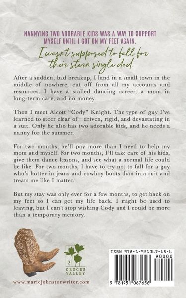 Nannying two adorable kids was a way to support myself until I got on my feet again. I wasn't supposed to fall for their stern single dad. After a sudden, bad breakup, I land in a small town in the middle of nowhere, cut off from all my accounts and resources. I have a stalled dancing career, a mom in long-term care, and no money. Then I meet Alcott "Cody" Knight. The type of guy I've learned to steer clear of-driven, rigid, and devastating in a suit. Only he also has two adorable kids, and he needs a nanny for the summer. For two months, he'll pay more than I need to help my mom and myself. For two months, I'll take care of his kids, give them dance lessons, and see what a normal life could be like. For two months, I have to try not to fall for a guy who's hotter in jeans and cowboy boots than in a suit and treats me like I matter. But my stay was only ever for a few months, to get back on my feet so I can get my life back. I might be used to leaving, but I can't stop wishing Cody and I could be more than a temporary memory.¿