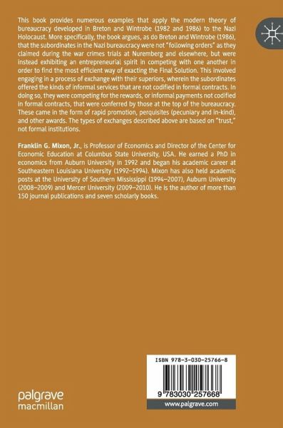 This book provides numerous examples that apply the modern theory of bureaucracy developed in Breton and Wintrobe (1982 and 1986) to the Nazi Holocaust. More specifically, the book argues, as do Breton and Wintrobe (1986), that the subordinates in the Nazi bureaucracy were not "following orders" as they claimed during the war crimes trials at Nuremberg and elsewhere, but were instead exhibiting an entrepreneurial spirit in competing with one another in order to find the most efficient way of exacting the Final Solution. This involved engaging in a process of exchange with their superiors, wherein the subordinates offered the kinds of informal services that are not codified in formal contracts. In doing so, they were competing for the rewards, or informal payments not codified in formal contracts, that were conferred by those at the top of the bureaucracy. These came in the form of rapid promotion, perquisites (pecuniary and in-kind), and other awards. The types of exchanges described above are based on "trust," not formal institutions.