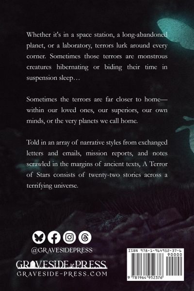 Short tales of fantastic fear. Whether it's in a space station, a long-abandoned planet, or a laboratory, terrors lurk around every corner. Sometimes those terrors are monstrous creatures hibernating or biding their time in suspension sleep ... Sometimes the terrors are far closer to home- within our loved ones, our superiors, our own minds, or the very planets we call home. Told in an array of narrative styles from exchanged letters and emails, mission reports, and notes scrawled in the margins of ancient texts, A Terror of Stars consists of twenty-two stories across a terrifying universe.
