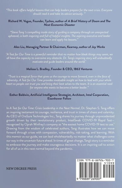 In A Test for Our Time: Crisis Leadership in the Next Normal, Dr. Stephen S. Tang offers an inspiring testament to courage, resilience, and trust in times of chaos and calamity. As CEO of OraSure Technologies Inc., Tang shares his journey through unprecedented growth driven by their revolutionary product, InteliSwab COVID-19 Rapid Test-recognized by Oprah Winfrey's company as "the easiest home COVID-19 test to use." Drawing from the wisdom of celebrated authors, Tang illustrates how we can move forward through crises with compassion, vulnerability, risk-taking, and learning. With this memoir as our guide, we can lead wholeheartedly no matter what challenges come our way in the uncertain future ahead. In times of great change, Tang's story is a reminder to embrace the journey and make courageous decisions. It is an inspiring call to action for all of us in this next normal beyond the pandemic.