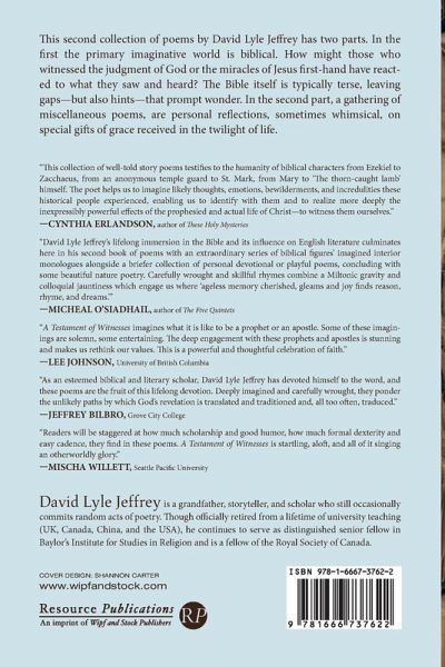 This second collection of poems by David Lyle Jeffrey has two parts. In the first the primary imaginative world is biblical. How might those who witnessed the judgment of God or the miracles of Jesus first-hand have reacted to what they saw and heard? The Bible itself is typically terse, leaving gaps--but also hints--that prompt wonder. In the second part, a gathering of miscellaneous poems, are personal reflections, sometimes whimsical, on special gifts of grace received in the twilight of life.