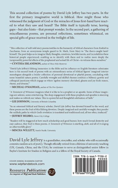 This second collection of poems by David Lyle Jeffrey has two parts. In the first the primary imaginative world is biblical. How might those who witnessed the judgment of God or the miracles of Jesus first-hand have reacted to what they saw and heard? The Bible itself is typically terse, leaving gaps--but also hints--that prompt wonder. In the second part, a gathering of miscellaneous poems, are personal reflections, sometimes whimsical, on special gifts of grace received in the twilight of life.