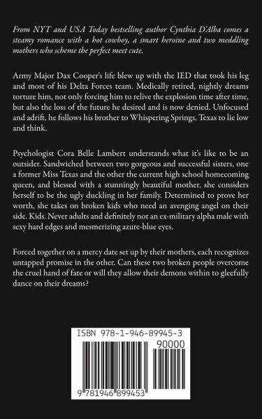 From NYT and USA Today bestselling author Cynthia D'Alba comes a steamy romance with a hot cowboy, a smart heroine and two meddling mothers who scheme the perfect meet cute. Army Major Dax Cooper's life blew up with the IED that took his leg and most of his Delta Forces team. Medically retired, nightly dreams torture him, not only forcing him to relive the explosion time after time, but also the loss of the future he desired and is now denied. Unfocused and adrift, he follows his brother to Whispering Springs, Texas to lie low and think. Psychologist Cora Belle Lambert understands what it's like to be an outsider. Sandwiched between two gorgeous and successful sisters, one a former Miss Texas and the other the current high school homecoming queen, and blessed with a stunningly beautiful mother, she considers herself to be the ugly duckling in her family. Determined to prove her worth, she takes on broken kids who need an avenging angel on their side. Kids. Never adults and definitely not an ex-military alpha male with sexy hard edges and mesmerizing azure-blue eyes. Forced together on a mercy date set up by their mothers, each recognizes untapped promise in the other. Can these two broken people overcome the cruel hand of fate or will they allow their demons within to gleefully dance on their dreams?