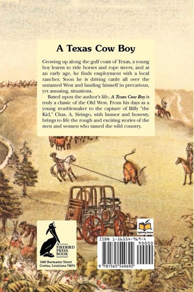 Growing up along the gulf coast of Texas, a young boy learns to ride horses and rope steers, and at an early age, he finds employment with a local rancher. Soon he is driving cattle all over the untamed West and landing in precarious, yet amusing, situations. Based upon the authorï¿1/2s life, A Texas Cow Boy is truly a classic of the Old West. From his days as a young troublemaker to the capture of Billy the Kid, Chas. A. Siringo, with humor and honesty, brings to life the rough and exciting stories of the men and women who tamed the wild country.