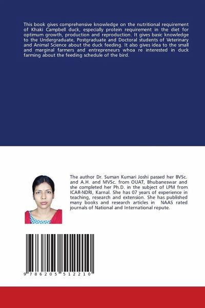 This book gives comprehensive knowledge on the nutritional requirement of Khaki Campbell duck, especially protein requirement in the diet for optimum growth, production and reproduction. It gives basic knowledge to the Undergraduate, Postgraduate and Doctoral students of Veterinary and Animal Science about the duck feeding. It also gives idea to the small and marginal farmers and entrepreneurs whoa re interested in duck farming about the feeding schedule of the bird.