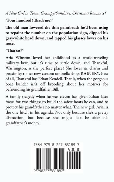 A New Girl in Town, Grumpy/Sunshine, Christmas Romance! "Four hundred! That's me!" The old man lowered the thin paintbrush he'd been using to repaint the number on the population sign, dipped his gray-white head down, and tapped his glasses lower on his nose. "That so?" Aria Winston loved her childhood as a world-traveling military brat, but it's time to settle down, and Thankful, Washington, is the perfect place! She loves its charm and proximity to her new custom umbrella shop, RAINERY. Best of all, Thankful has Ethan Kendell. That is, when the gorgeous boat builder isn't off brooding about her motives for befriending his grandfather, Bill. A family tragedy when he was eleven has given Ethan laser focus for two things: to build the safest boats he can, and to protect his grandfather no matter what. The new girl, Aria, is the one hitch in his agenda. Not only because she's a pretty distraction, but because she might just be after his grandfather's money.