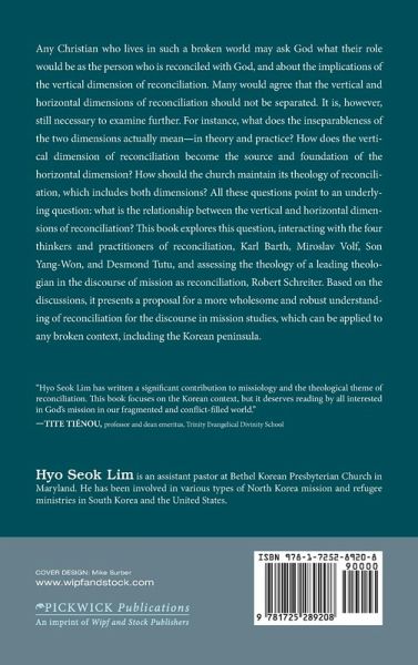 Any Christian who lives in such a broken world may ask God what their role would be as the person who is reconciled with God, and about the implications of the vertical dimension of reconciliation. Many would agree that the vertical and horizontal dimensions of reconciliation should not be separated. It is, however, still necessary to examine further. For instance, what does the inseparableness of the two dimensions actually mean--in theory and practice? How does the vertical dimension of reconciliation become the source and foundation of the horizontal dimension? How should the church maintain its theology of reconciliation, which includes both dimensions? All these questions point to an underlying question: what is the relationship between the vertical and horizontal dimensions of reconciliation? This book explores this question, interacting with the four thinkers and practitioners of reconciliation, Karl Barth, Miroslav Volf, Son Yang-Won, and Desmond Tutu, and assessing the theology of a leading theologian in the discourse of mission as reconciliation, Robert Schreiter. Based on the discussions, it presents a proposal for a more wholesome and robust understanding of reconciliation for the discourse in mission studies, which can be applied to any broken context, including the Korean peninsula.