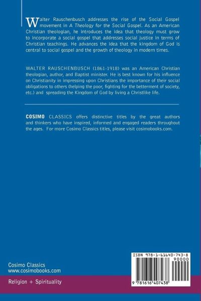 Walter Rauschenbusch addresses the rise of the Social Gospel movement in A Theology for the Social Gospel. As an American Christian theologian, he introduces the idea that theology must grow to incorporate a social gospel that addresses social justice in terms of Christian teachings. He advances the idea that the kingdom of God is central to social gospel and the growth of theology in modern times. WALTER RAUSCHENBUSCH (1861-1918) was an American Christian theologian, author, and Baptist minister. He is best known for his influence on Christianity in impressing upon Christians the importance of their social obligations to others (helping the poor, fighting for the betterment of society, etc.) and spreading the Kingdom of God by living a Christlike life.