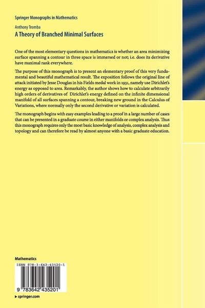 "The author provides a self-contained study of a theory of branched minimal surfaces. ... The goal of the book is to study the question whether an area minimizing surface spanning a contour in three dimensional space is immersed or not, that is does its derivative have maximal rank everywhere. The exposition starts with some simple examples and continues with nicely presented proofs. The book can be useful for a graduate course or seminar." (Themistocles M. Rassias, Zentralblatt MATH, Vol. 1247, 2012)