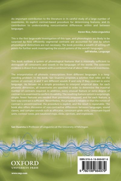 This book outlines a system of phonological features that is minimally sufficient to distinguish all consonants and vowels in the languages of the world. The extensive evidence is drawn from datasets with a combined total of about 1000 sound inventories. The interpretation of phonetic transcriptions from different languages is a long-standing problem. In this book, San Duanmu proposes a solution that relies on the notion of contrast: X and Y are different sounds if and only if they contrast in some language. He focuses on a simple procedure to interpret empirical data: for each phonetic dimension, all inventories are searched in order to determine the maximal number of contrasts required. In addition, every unusual feature or extra degree of contrast is re-examined to confirm its validity. The resulting feature system is surprisingly simple: fewer features are needed than previously proposed, and for each feature, a two-way contrast is sufficient. Nevertheless, the proposal is reliable in that the notion of contrast is uncontroversial, the procedure is explicit, and the result is repeatable. The book also offers discussion of non-contrastive differences between languages, sound classes, and complex sounds such as affricates, consonant-glide units, consonant-liquid units, contour tones, pre-nasalized stops, clicks, ejectives, and implosives.