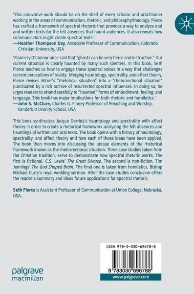 This book synthesizes Jacques Derrida's hauntology and spectrality with affect theory, in order to create a rhetorical framework analyzing the felt absences and hauntings of written and oral texts. The book opens with a history of hauntology, spectrality, and affect theory and how each of those ideas have been applied. The book then moves into discussing the unique elements of the rhetorical framework known as the rhetorrectional situation. Three case studies taken from the Christian tradition, serve to demonstrate how spectral rhetoric works. The first is fictional, C.S. Lewis 'The Great Divorce. The second is non-fiction, Tim Jennings 'The God Shaped Brain. The final one is taken from homiletics, Bishop Michael Curry's royal wedding 2018 sermon. After the case studies conclusion offers the reader a summary and ideas future applications for spectral rhetoric.