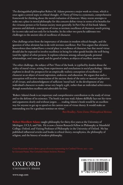 A Theory of Virtue is a systematic, comprehensive framework for thinking about the moral evaluation of character, proposing that virtue is chiefly a matter of being for what is good, and that virtues must be intrinsically excellent and not just beneficial or useful.