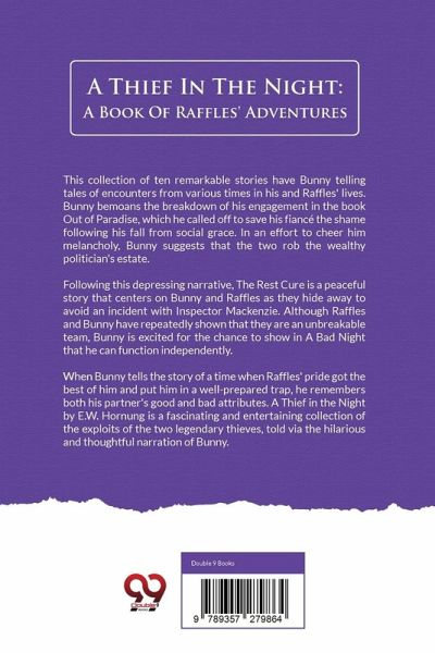 This collection of ten remarkable stories have Bunny telling tales of encounters from various times in his and Raffles' lives. Bunny bemoans the breakdown of his engagement in the book Out of Paradise, which he called off to save his fiancé the shame following his fall from social grace. In an effort to cheer him melancholy, Bunny suggests that the two rob the wealthy politician's estate. Following this depressing narrative, The Rest Cure is a peaceful story that centers on Bunny and Raffles as they hide away to avoid an incident with Inspector Mackenzie. Although Raffles and Bunny have repeatedly shown that they are an unbreakable team, Bunny is excited for the chance to show in A Bad Night that he can function independently. When Bunny tells the story of a time when Raffles' pride got the best of him and put him in a well-prepared trap, he remembers both his partner's good and bad attributes. A Thief in the Night by E.W. Hornung is a fascinating and entertaining collection of the exploits of the two legendary thieves, told via the hilarious and thoughtful narration of Bunny.