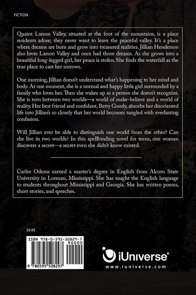 Quaint Larson Valley, situated at the foot of the mountains, is a place residents adore; they never want to leave the peaceful valley. It's a place where dreams are born and grow into treasured realities. Jillian Henderson also loves Larson Valley and once had those dreams. As she grows into a beautiful long-legged girl, her peace is stolen. She finds the waterfall as the true place to cast her sorrows. One morning, Jillian doesn't understand what's happening to her mind and body. At one moment, she is a normal and happy little girl surrounded by a family who loves her. Then she wakes up as a person she doesn't recognize. She is torn between two worlds-a world of make-believe and a world of reality. Her best friend and confidant, Betty Goody, absorbs her disoriented life into Jillian's so closely that her world becomes tangled with everlasting confusion. Will Jillian ever be able to distinguish one world from the other? Can she live in two worlds? In this spellbinding novel for teens, one woman discovers a secret-a secret even she didn't know existed.