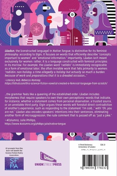 This book includes material from 1st Dictionary and Grammar (1988) and merges it with new vocabulary created for the Láadan website. Elgin died in 2015, but interest persists in the language she created in 1982, embodied in her SF "Native Tongue" series. Láadan is a feminist constructed language created by Elgin to test the Sapir-Whorf hypothesis that the language one speaks influences the way one thinks, i.e., can a language expressing the views of women shape a culture? Láadan includes morphemes that require speakers to own their own perceptions-words that indicate, for instance, whether a statement comes from personal observation, a trusted source, or an unreliable third party. Nowadays Elgin might argue that accusations of "fake news" would be impossible in Láadan. This language also encodes speakers' intentions into their sentences, eliminating another form of micro-aggression, the rude comment that is passed off as "just a joke." All proceeds will go to the Science Fiction Poetry Association.
