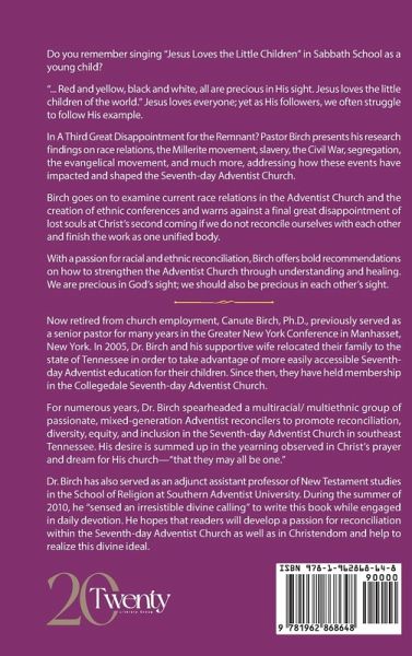 Do you remember singing "Jesus Loves the Little Children" in Sabbath School as a young child? "... Red and yellow, black and white, all are precious in His sight. Jesus loves the little children of the world." Jesus loves everyone; yet as His followers, we often struggle to follow His example. In A Third Great Disappointment for the Remnant? Pastor Birch presents his research findings on race relations, the Millerite movement, slavery, the Civil War, segregation, the evangelical movement, and much more, addressing how these events have impacted and shaped the Seventh-day Adventist Church. Birch goes on to examine current race relations in the Adventist Church and the creation of ethnic conferences and warns against a final great disappointment of lost souls at Christ's second coming if we do not reconcile ourselves with each other and finish the work as one unified body. With a passion for racial and ethnic reconciliation, Birch offers bold recommendations on how to strengthen the Adventist Church through understanding and healing. We are precious in God's sight; we should also be precious in each other's sight. Now retired from church employment, Canute Birch, Ph.D., previously served as a senior pastor for many years in the Greater New York Conference in Manhasset, New York. In 2005, Dr. Birch and his supportive wife relocated their family to the state of Tennessee in order to take advantage of more easily accessible Seventh-day Adventist education for their children. Since then, they have held membership in the Collegedale Seventh-day Adventist Church. For numerous years, Dr. Birch spearheaded a multiracial/ multiethnic group of passionate, mixed-generation Adventist reconcilers to promote reconciliation, diversity, equity, and inclusion in the Seventh-day Adventist Church in southeast Tennessee. His desire is summed up in the yearning observed in Christ's prayer and dream for His church-"that they may all be one." Dr. Birch has also served as an adjunct assistant professor of New Testament studies in the School of Religion at Southern Adventist University. During the summer of 2010, he "sensed an irresistible divine calling" to write this book while engaged in daily devotion. He hopes that readers will develop a passion for reconciliation within the Seventh-day Adventist Church as well as in Christendom and help to realize this divine ideal.