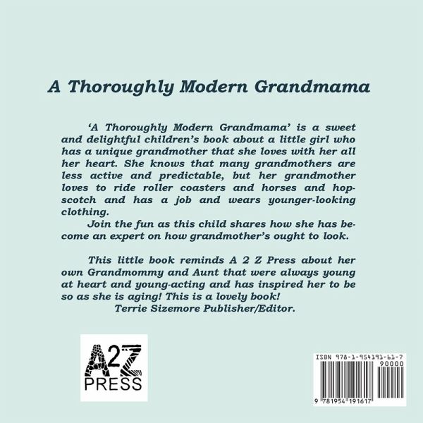 A lovely 32 page children's picture book told in rhyme about a very modern and fun grandma!! Join the fun and help the young reader learn to read as well as enjoy being reminded of how fun their own grandma is! Filled with colorful pictures to engage the young reader.