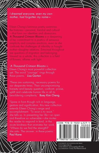Eileen Chong's luminous poetry examines the histories--personal, familial, and cultural--that form our identities and obsessions. A Thousand Crimson Blooms is a deepening of her commitment to a poetics of sensuous simplicity and complex emotions, even as she confronts the challenges of infertility or fraught mother-daughter relations. Entwined throughout are questions of migration and belonging. Viewed as a whole, this collection is a field of flowers, aflame with light.