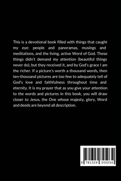 This is a Christian devotional book featuring original photographs coupled with Scriptures and quotes on devotional themes. It is a place to see the Father, Son and Holy Spirit with your eyes, your mind and your heart.