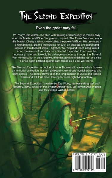 Even the great may fall. Wu Ying's idle winter, one filled with training and recovery, is throw awry when his Master and Elder Yang return, injured. The Three Seasons poison fills Master Cheng's veins, slowly killing the powerful Elder. His only hope - a rare antidote. But the ingredients for such an antidote are scarce and located in the deepest wilds. Together, Wu Ying and Elder Yang take it upon themselves to embark on a Second Expedition to acquire the necessary materials. It would be a dangerous journey through the State of Wei normally, but in the shadows, enemies await to finish the job. Wu Ying is once again pitched against dark forces as a Sect war looms. The Second Expedition is book 4 of the A Thousand Li series which focuses on immortal cultivation, eastern philosophy, wondrous martial art styles and spirit beasts. The series draws upon the long tradition of wuxia and xianxia works and will thrill those looking for such high flying fantasy. The Second Expedition is written by Tao Wong, the bestselling scifi and fantasy LitRPG author of the System Apocalypse, the Adventures on Brad and the Hidden Wishes series.