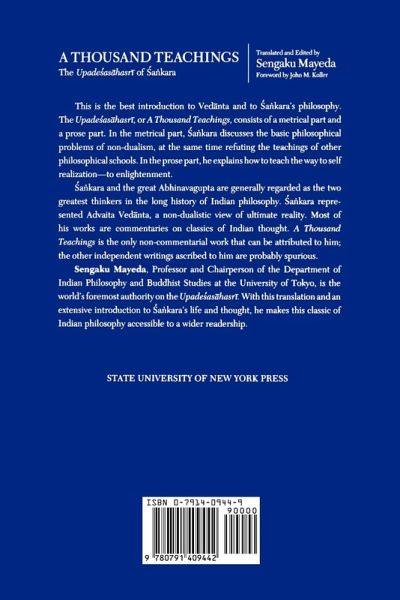 This is the best introduction to Vedanta and to ¿äkara's philosophy. The Upade¿as¿hasr¿, or A Thousand Teachings consists of a metrical part and a prose part. In the metrical part, Sankara discusses the basic philosophical problems of non-dualism, at the same time refuting the teachings of other philosophical schools. In the prose part, he explains how to teach the way to self realization-to enlightenment. ¿äkara and the great Abhinavagupta are generally regarded as the two greatest thinkers in the long history of Indian philosophy. Sankara represented Advaita Vedanta, a non-dualistic view of ultimate reality. Most of his works are commentaries on classics of Indian thought. A Thousand Teachings is the only non-commentarial work that can be attributed to him; the other independent writings ascribed to him are probably spurious.