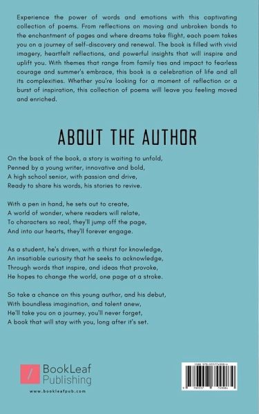 Experience the power of words and emotions with this captivating collection of poems. From reflections on moving and unbroken bonds to the enchantment of pages and where dreams take flight, each poem takes you on a journey of self-discovery and renewal. The book is filled with vivid imagery, heartfelt reflections, and powerful insights that will inspire and uplift you. With themes that range from family ties and impact to fearless courage and summer's embrace, this book is a celebration of life and all its complexities. Whether you're looking for a moment of reflection or a burst of inspiration, this collection of poems will leave you feeling moved and enriched.