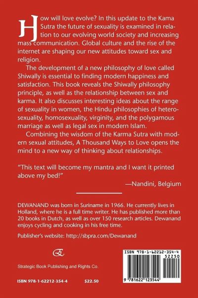 How will love evolve? In this update to the Kama Sutra the future of sexuality is examined in relation to our evolving world society and increasing mass communication. Global culture and the rise of the internet are shaping our new attitudes toward sex and religion. The development of a new philosophy of love called Shiwally is essential to finding modern happiness and satisfaction. This book reveals the Shiwally philosophy principle, as well as the relationship between sex and karma. It also discusses interesting ideas about the range of sexuality in women, the Hindu philosophies of heterosexuality, homosexuality, virginity, and the polygamous marriage as well as legal sex in modern Islam. Combining the wisdom of the Karma Sutra with modern sexual attitudes, A Thousand Ways to Love opens the mind to a new way of thinking about relationships. "This text will become my mantra and I want it printed above my bed!" -Nandini, Belgium Dewanand was born in Suriname in 1966. He currently lives in Holland, where he is a full time writer. He has published more than 20 books in Dutch, as well as over 150 research articles. Dewanand enjoys cycling and cooking in his free time. Publisher's website: http://sbpra.com/Dewanand
