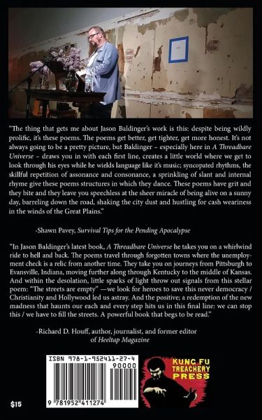 The thing that gets me about Jason Baldinger's work is this: despite being wildly prolific, it's these poems. The poems get better, get tighter, get more honest. It's not always going to be a pretty picture, but Baldinger - especially here in A Threadbare Universe - draws you in with each first line, creates a little world where we get to look through his eyes while he wields language like it's music; syncopated rhythms, the skillful repetition of assonance and consonance, a sprinkling of slant and internal rhyme give these poems structures in which they dance. These poems have grit and they bite and they leave you speechless at the sheer miracle of being alive on a sunny day, barreling down the road, shaking the city dust and hustling for cash weariness in the winds of the Great Plains. Shawn Pavey Author of Survival Tips for the Pending Apocalypse In Jason Baldinger's latest book, "A Threadbare Universe" he takes you on a whirlwind ride to hell and back. The poems travel through forgotten towns where the unemployment check is a relic from another time. They take you on journeys from Pittsburgh to Evansville, Indiana, moving further along through Kentucky to the middle of Kansas. And within the desolation, little sparks of light throw out signals from this stellar poem: "The streets are empty" -we look for heroes to save this never democracy / Christianity and Hollywood led us astray. And the positive; a redemption of the new madness that haunts our each and every step hits us in this final line: we can stop this / we have to fill the streets. A powerful book that begs to be read. Richard D. Houff Author, journalist, and former editor of Heeltap Magazine Jason Baldinger's writing is an example of the best American poetry today. A Threadbare Universe takes America's temperature and awakens us. It's a poignant call from complacency, a brilliant rendition, breathtaking in its solace and lament. Jyl Anais Author of Soft Out Spoken Beneath the blue collar of Baldinger's poems lies dirt, nostalgia, a sweet solitude built of both victory and sadness. To read is to ride shotgun with road map an unfolded wreckage with America hungover in the backseat. Every stop to stretch legs and take a piss is colored by working blues and morning afters. There is coming-of-age, and there is coming to terms--this collection of work exquisitely calls forth the latter. Nikki Allen Poet