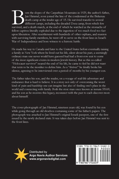 Born on the slopes of the Carpathian Mountains in 1929, author Dan Himmel’s father soon joined the line of the condemned at the Birkenau death camp at the tender age of 15. He survived transfer to several different camps, including the dreaded Dora camp, from which few survived, and a death march, at the end of which he watched as the stomachs of fellow captives literally exploded due to the ingestion of food too quickly upon liberation. After resettlement with hundreds of other orphans and reunion with surviving family members, he went off to serve on the front lines in Israel's war of independence and bore witness to a historic battle. He made his way to Canada, and then to the United States, eventually getting married and raising a family in New York, where he lived out his life as a seemingly unremarkable man--one you would never guess had had a front-row seat to some of the most significant events in modern Jewish history. For most of his life, he barely made mention of his Holocaust experience, certainly not to any of his three children, whom he wanted to protect from the pain he had suffered and in some ways continued to endure throughout his life. But as this “thriver” neared the end of his life, he finally agreed to be interviewed over a period of months by his youngest son, who found answers to his own questions about his father’s demeanor and parenting style while discovering a newfound sense of identity. The author ultimately gains a totally new understanding of what it means to be the child of a Holocaust survivor as he comes to see his father as not so much a survivor as a thriver, an inspiration, a man whose journey infuses intense meaning into his own sense of identity