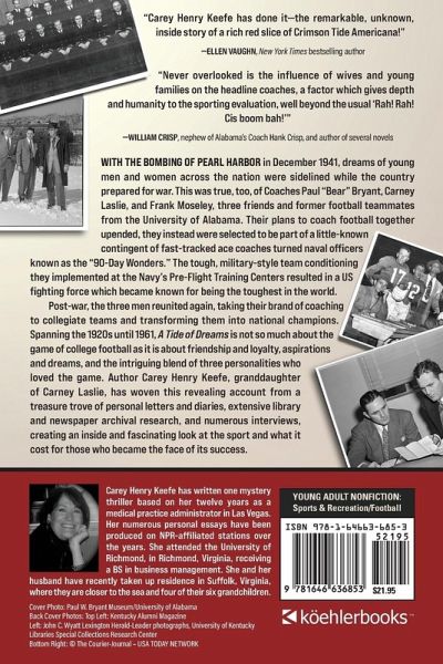 When the U.S. declared war on Japan after Pearl Harbor was bombed in December 1941, the dreams of young men and women across the nation were sidelined. So, too, were the plans Coaches Paul "Bear" Bryant, Carney Laslie, and Frank Moseley, a dream team of coaching talent and three friends and ex-football players from the University of Alabama, who had plans to coach football together. Their plans upended, these three friends and ex-teammates from the University of Alabama, instead join the Navy, among an elite group of 800 coaches, selected out of 20,000 who applied from around the country, to be part of a contingent of ace coaches trained in a fast-tracked officer training program at the Naval Academy in Annapolis. Known as a "90-Day Wonder", these coaches turned naval officers implemented a merciless military-style team conditioning at the newly installed Navy Pre-Flight Training Centers. The revolutionary new training regimen used sports to prepare WWII aviators and was credited for US fighting forces being known as the toughest in the world. Post-war, the three reunite in their first coaching job together, bringing their brand of coaching to collegiate teams and transforming them into national champions. Spanning the 1920s until 1961, A TIDE OF DREAMS is not so much about the game of college football as it is about friendship and loyalty, aspirations and dreams, and the intriguing blend of three personalities who loved the game, told against the backdrop of the history of the sport and the nation. Author Carey Henry Keefe, granddaughter of Carney Laslie, weaves this poignant and personal account from a treasure trove of personal letters, diaries, interviews, and newspaper and University archival research, creating an inside and fascinating look at the sport and what it cost for those who became the face of its success.