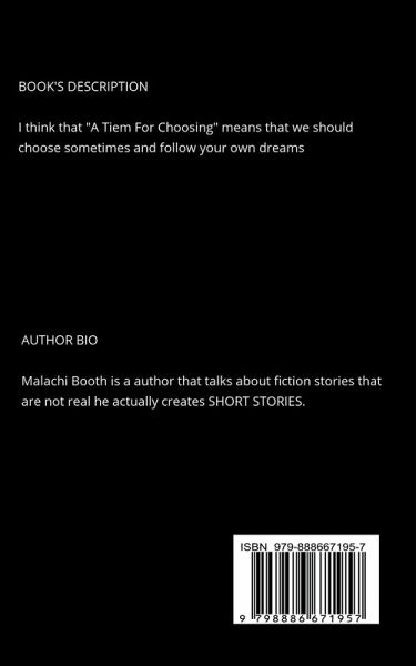 MALACHI BOOTH made this book to talk about ELECTIONS and when the time for CHOOSING comes. THIS BOOK is very helpful because it talks about a lot of STORIES that have been made THROUGH mistakes. And to not make that SAME MISTAKE again.