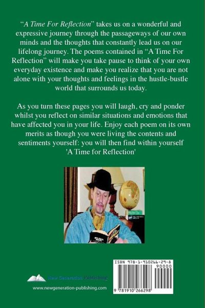 "A Time For Reflection" takes us on a wonderful and expressive journey through the passageways of our own minds and the thoughts that constantly lead us on our lifelong journey. The poems contained in "A Time For Reflection" will make you take pause to think of your own everyday existence and make you realize that you are not alone with your thoughts and feelings in the hustle-bustle world that surrounds us today. As you turn these pages you will laugh, cry and ponder whilst you reflect on similar situations and emotions that have affected you in your life. Enjoy each poem on its own merits as though you were living the contents and sentiments yourself: you will then find within yourself 'A Time for Reflection'.