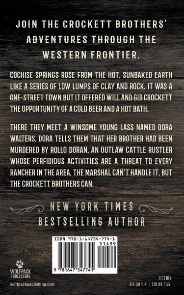 Join the Crockett brothers' adventures through the western frontier. Cochise Springs rose from the hot, sunbaked earth like a series of low lumps of clay and rock. It was a one-street town but it offered Will and Gid Crockett the opportunity of a cold beer and a hot bath. There they meet a winsome young lass named Dora Walters. Dora tells them that her brother had been murdered by Rollo Doran, an outlaw cattle rustler whose perfidious activities are a threat to every rancher in the area. The marshal can't handle it, but the Crockett brothers can.