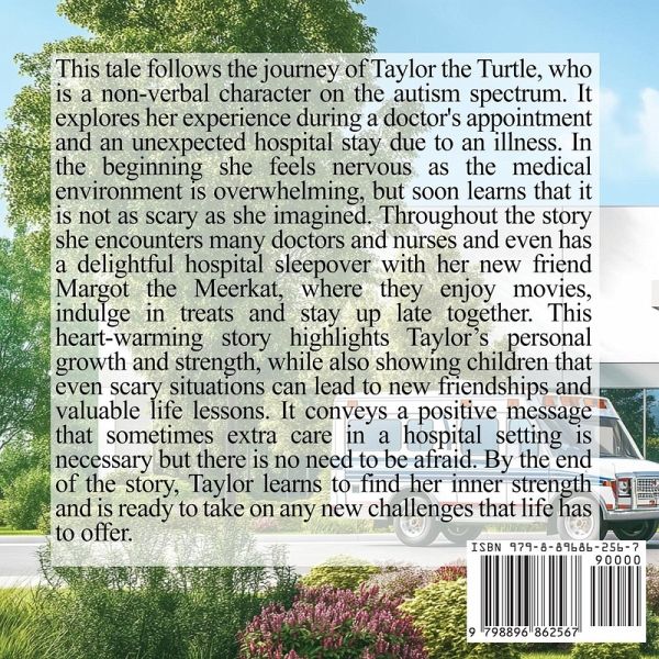 This story is part of the book series 'Taylor's Tales' and they can be read in any order. The first story is about friendship 'Out of My Shell: Taylor's Tale of Friendship', the second is about exploring the sensory world 'Discovering the World: Taylor's Tale of Sensory Exploration', the third is about starting school in an Autism Class 'Finding My Feet: Taylor's Tale of Starting School'. This tale follows the journey of Taylor the Turtle, who is a charming non-verbal character on the autism spectrum. It explores her experience during a doctor's appointment and an unexpected hospital stay due to an illness. In the beginning she feels nervous as the medical environment is overwhelming, especially due to the busy environment filled with unfamiliar faces, loud sounds, and bright lights. Throughout the story she encounters many doctors and nurses and even has a delightful hospital sleepover with her new friend Margot the Meerkat, where they enjoy movies, indulge in treats and stay up late together. She learns that the hospital is not as scary as she imagined. This heart-warming story highlights Taylor's personal growth and strength, while also showing children that even scary situations can lead to new friendships and valuable life lessons. It conveys a positive message that sometimes extra care in a hospital setting is necessary but there is no need to be afraid. By the end of the story, Taylor learns to find her inner strength and is ready to take on any new challenges that life has to offer. The characters in the book are inspired by the amazing people in Taylor's life, who offer her so much support and guidance. I hope you enjoy reading the story as much as I enjoyed writing it, and always remember to embrace your differences and express you are!