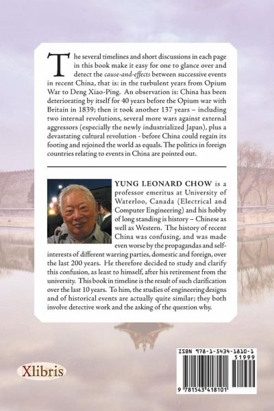The several timelines and short discussions in each page in this book make it easy for one to glance over and detect the cause-and-effects between successive events in recent China, that is: in the turbulent years from Opium War to Deng Xiao-Ping. An observation is: China has been deteriorating by itself for 40 years before the Opium war with Britain in 1839; then it took another 137 years including two internal revolutions, several more wars against external aggressors (especially the newly industrialized Japan), plus a devastating cultural revolution - before China could regain its footing and rejoined the world as equals. The politics in foreign countries relating to events in China are pointed out.