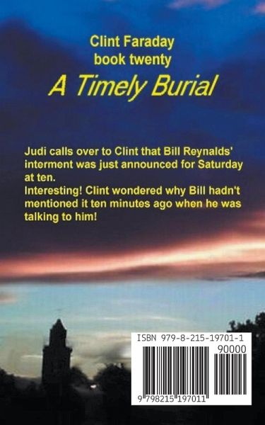 Large print Clint gets home to have Judi inform him the a friend's funeral was just announced on TV. That sort of pissed Clint off, that he wasn't told about it when he was talking to the guy ten minutes ago. It leads to a group of corrupt local officials and a n investigation of the man's murder. This was a strange one, even for Clint Faraday!