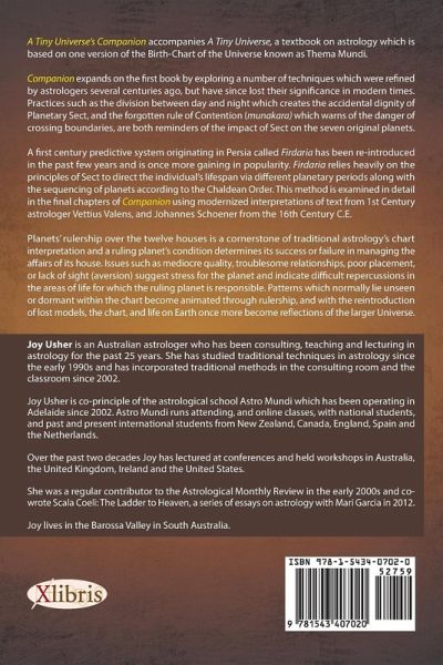 A Tiny Universe's Companion accompanies A Tiny Universe, a textbook on astrology which is based on one version of the Birth-Chart of the Universe known as Thema Mundi. Companion expands on the fi rst book by exploring a number of techniques which were refined by astrologers several centuries ago, but have since lost their significance in modern times. Practices such as the division between day and night which creates the accidental dignity of Planetary Sect, and the forgotten rule of Contention (munakara) which warns of the danger of crossing boundaries, are both reminders of the impact of Sect on the seven original planets. A first century predictive system originating in Persia called Firdaria has been re-introduced in the past few years and is once more gaining in popularity. Firdaria relies heavily on the principles of Sect to direct the individual's lifespan via different planetary periods along with the sequencing of planets according to the Chaldean Order. This method is examined in detail in the final chapters of Companion using modernized interpretations of text from 1st Century astrologer Vettius Valens, and Johannes Schoener from the 16th Century C.E. Planets' rulership over the twelve houses is a cornerstone of traditional astrology's chart interpretation and a ruling planet's condition determines its success or failure in managing the aff airs of its house. Issues such as mediocre quality, troublesome relationships, poor placement, or lack of sight (aversion) suggest stress for the planet and indicate difficult repercussions in the areas of life for which the ruling planet is responsible. Patterns which normally lie unseen or dormant within the chart become animated through rulership, and with the reintroduction of lost models, the chart, and life on Earth once more become reflections of the larger Universe.
