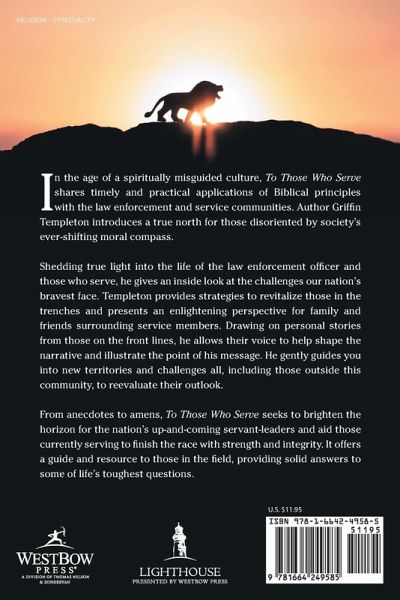 To Those Who Serve shares timely and practical applications of Biblical principles with the law enforcement and service communities. Author Griffin Templeton introduces a true north for those disoriented by society's ever-shifting moral compass. Shedding true light into the life of the law enforcement officer and those who serve, he gives an inside look at the challenges our nation's bravest face. Templeton provides strategies to revitalize those in the trenches and presents an enlightening perspective for family and friends surrounding service members. Drawing on personal stories from those on the front lines, he allows their voice to help shape the narrative and illustrate the point of his message. He gently guides you into new territories and challenges all, including those outside this community, to reevaluate their outlook. From anecdotes to amens, To Those Who Serve seeks to brighten the horizon for the nation's up-and-coming servant-leaders and aid those currently serving to finish the race with strength and integrity. It offers a guide and resource to those in the field, providing solid answers to some of life's toughest questions.
